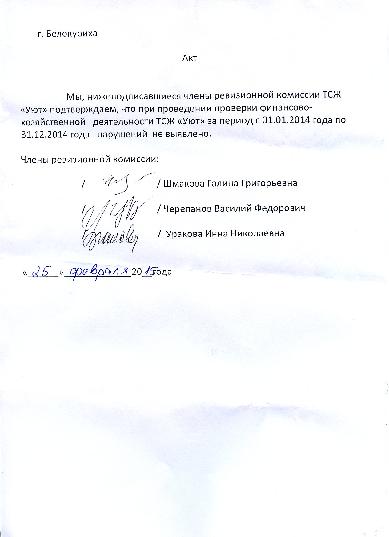 Акт проверки финансово-хозяйственной деятельности ТСЖ "Уют" за период с 01.01.2014 г. по 31.12.2014 г.