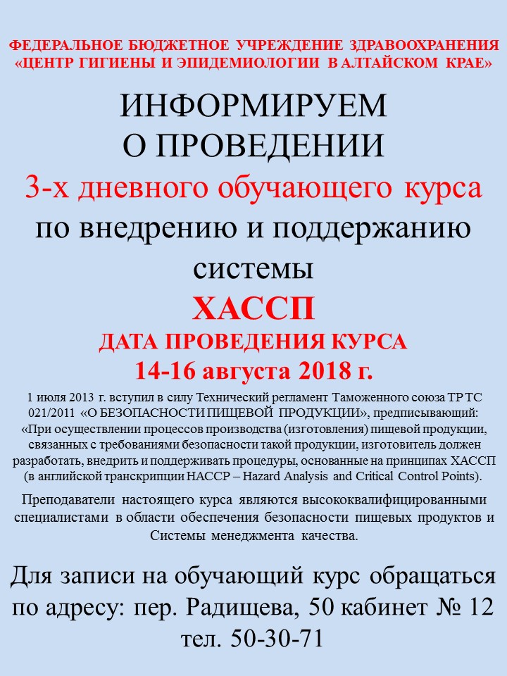 информирует о проведение 3-дневного обучающего курса по внедрению и поддержанию системы ХАССП.